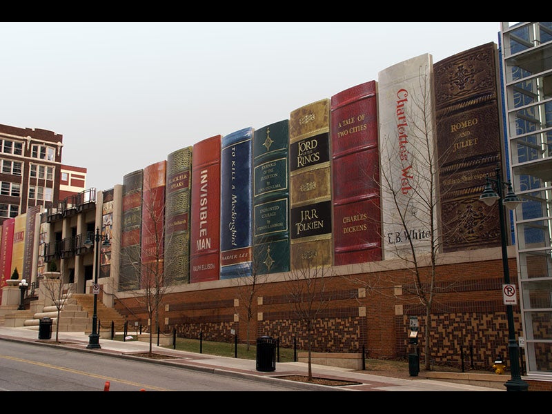 We bought our copy of Jonston’s Historia naturalis at auction in 1982 and since the bindings had deteriorated, we had the two volumes rebound in beautiful blue half-calf bindings. The volumes are so attractive that one of them was chosen to be the model for one of the large book spines erected outside the Kansas City Public Library parking garage (sixth image). The spine label was changed from “Jonston, Hist. Nat. de Avibus” to read: “A Tale of Two Cities, Charles Dickens”. In the photo above, Dickens nee Jonston sits between Lord of the Rings and Charlotte’s Web.
