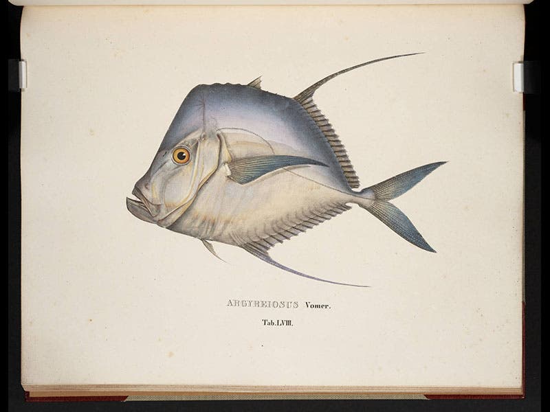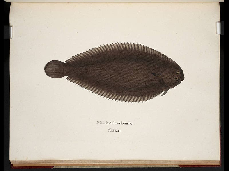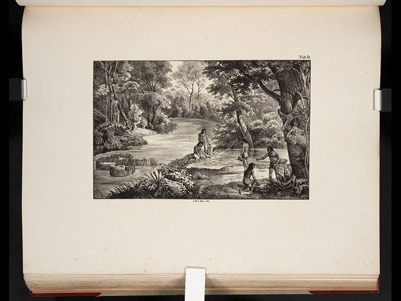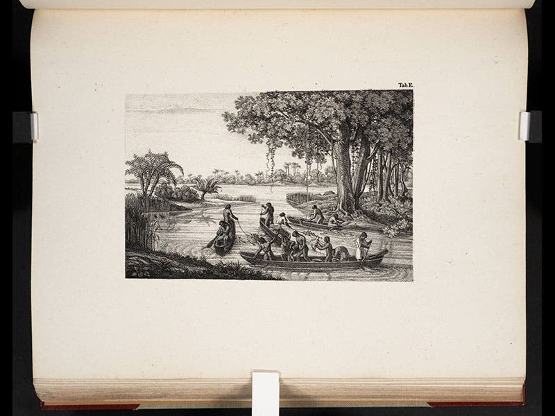 The illustrations in the volume were of two kinds—large, hand-colored engravings of fish, and smaller lithographs showing the various methods by which the Brazilians caught their fish. We see samples of both above; the fish are, in order: a piranha, a lookdown, and a Brazilian sole. We displayed the lookdown in our recent exhibition on lithography, Crayon and Stone, which is not yet online.