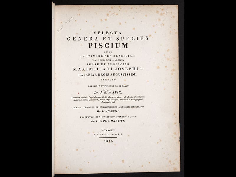 In 1827, a young Swiss student came to Munich to study; his name was Louis Agassiz. He soon impressed his teachers with his eagerness and intelligence, and it occurred to Martius that this might be just the man to finish the Spix volume on fish. Agassiz was honored to be so chosen and threw himself into the task, and the Selecta Genera et Species Piscium, a large handsome folio, was published in 1829--Agassiz's first book, although he was more editor than author.