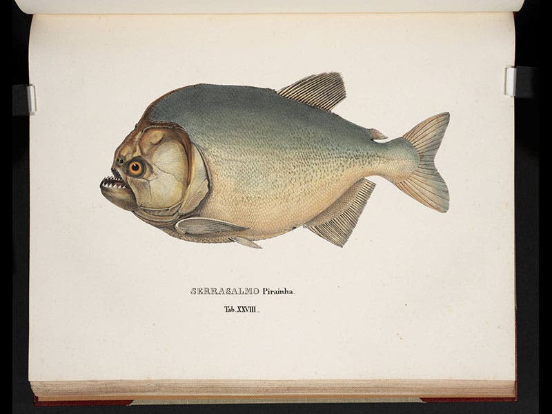 Johann Baptist von Spix, a German naturalist, was born Feb. 9, 1781. In 1817, he left Munich for Brazil, at the request of King Maximillian Joseph of Bavaria, and in the company of the botanist Carl von Martius. They explored much of the interior, then separated, and Spix went up the Amazon to Peru, collecting specimens all the way. They re-united and returned to Bavaria in 1820, with thousands of plants and insects, and quite a few new mammals, birds, and fish. Spix immediately set about publishing the results of his trip, and managed to produce several volumes of studies, but he died in 1826, before he could finish, of diseases acquired on the expedition. One of the volumes left unpublished was the one on fish.