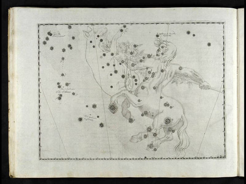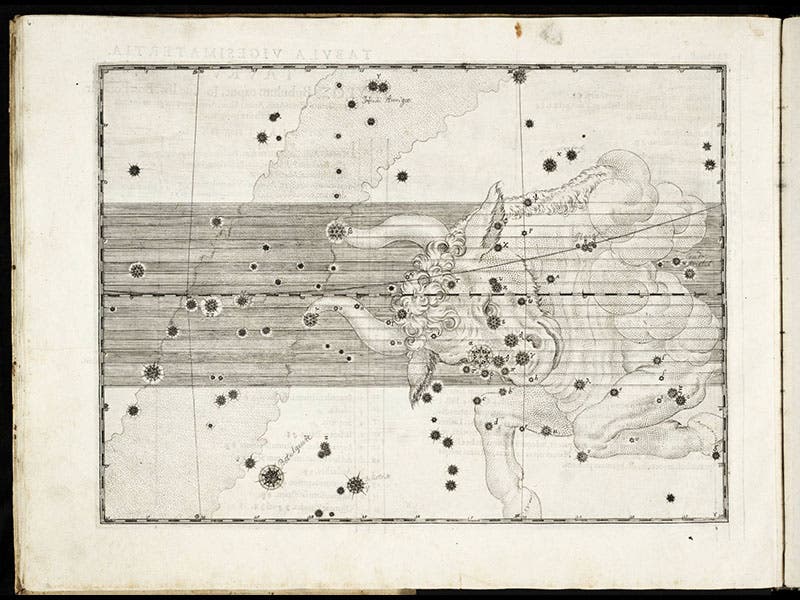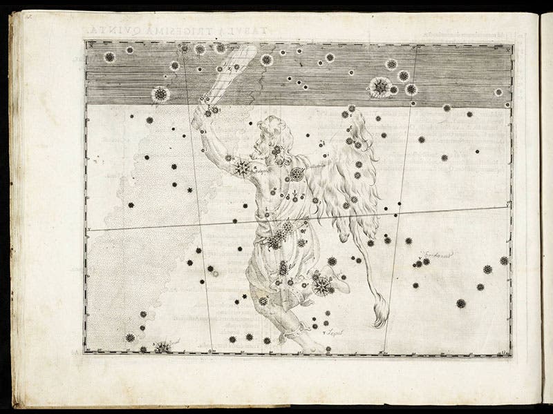 To the non-astronomer, the most striking features of the plates are the attractive constellation figures. We display above the plates for Orion, Cetaurus, Cetus, Taurus, and Argo navis. To the astronomer, the atlas is significant because it introduced the practice of designating bright stars by letters of the Greek alphabet; alpha Centauri is a familiar example (second image), as is alpha Tauri (Aldebaran; fourth image), and beta Orionis (Rigel; first image).