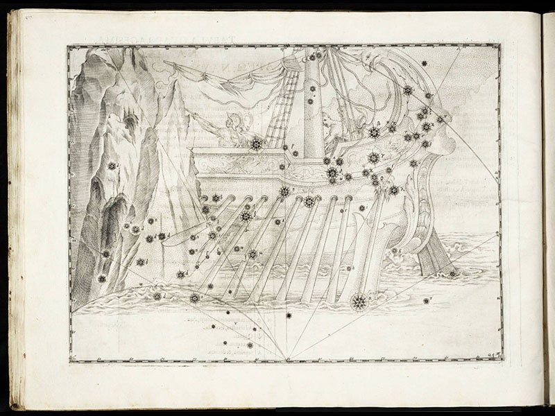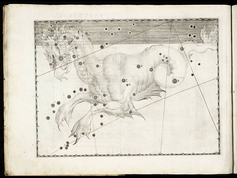 To the non-astronomer, the most striking features of the plates are the attractive constellation figures. We display above the plates for Orion, Cetaurus, Cetus, Taurus, and Argo navis. To the astronomer, the atlas is significant because it introduced the practice of designating bright stars by letters of the Greek alphabet; alpha Centauri is a familiar example (second image), as is alpha Tauri (Aldebaran; fourth image), and beta Orionis (Rigel; first image).