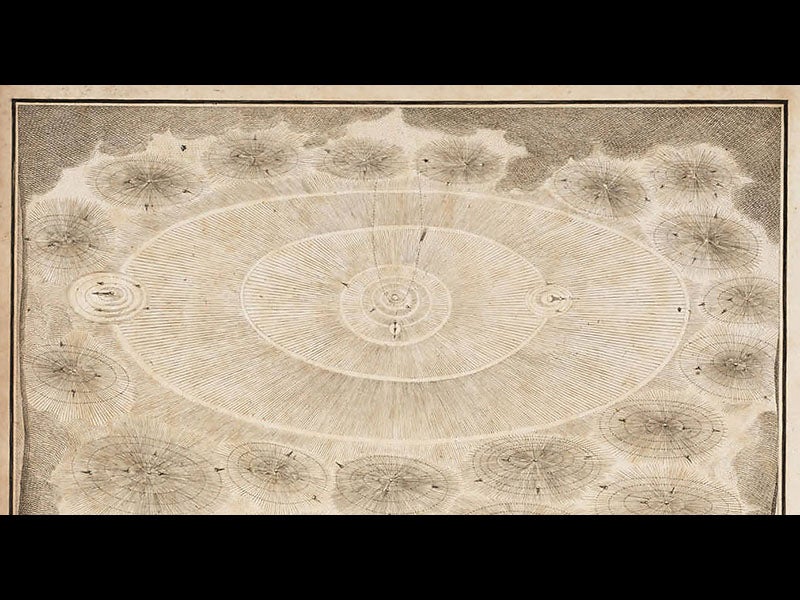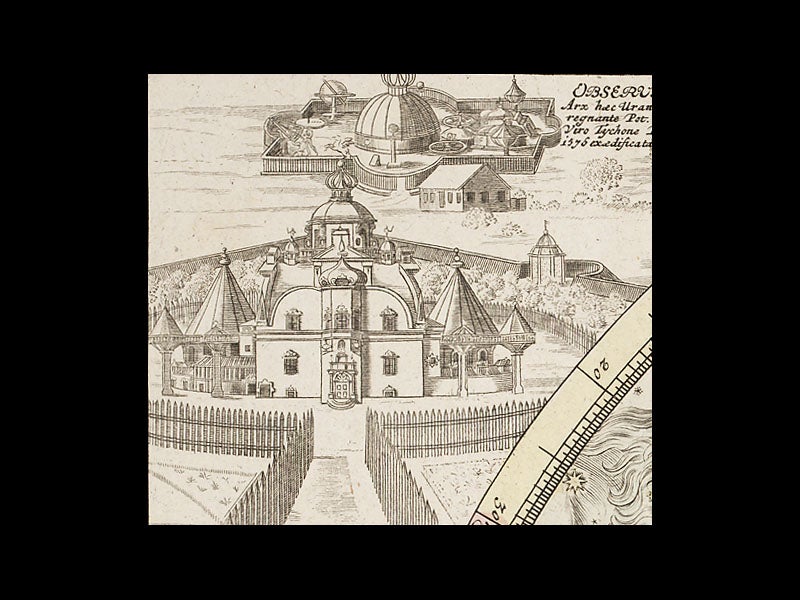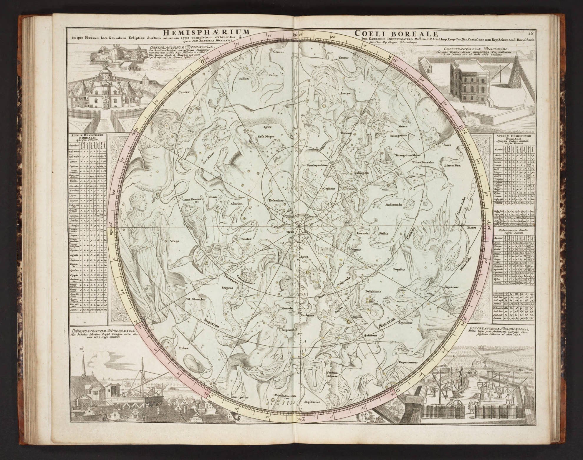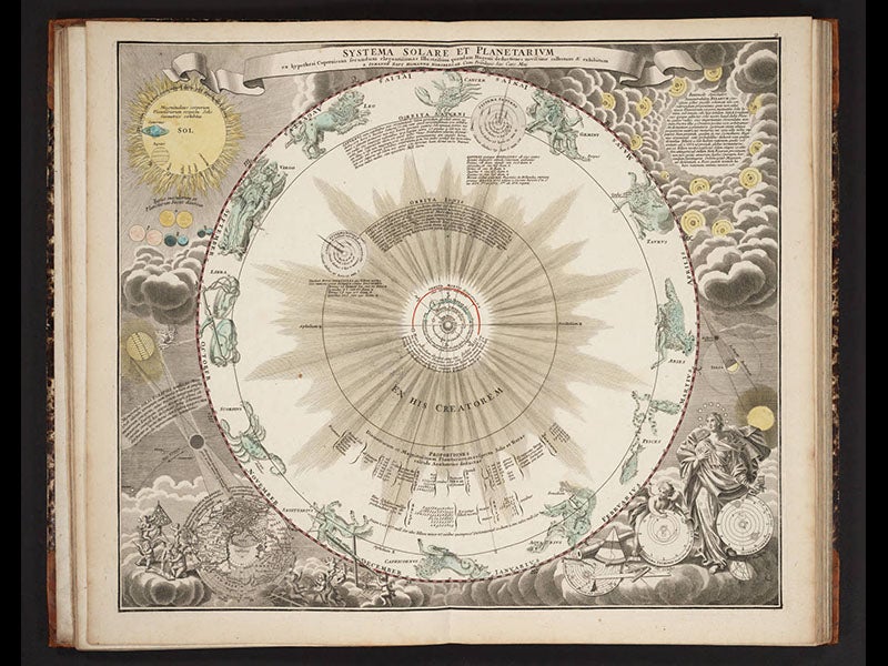 Johann Gabriel Doppelmayr, a German astronomer and mathematician, died Dec. 1, 1750, at age 73. In 1742, Doppelmayr published a collection of cosmological and astronomical charts that he called Atlas coelestis. The title was a little misleading, since the volume was much more than a celestial atlas, although it does indeed include ten star maps. The book is attractive not only because the plates are large and hand-colored, but because the engravings often include vignettes in the corners of considerable historical interest. For example, the plate that shows the planets of the solar system (second image above), contains, in the upper left corner, Christiaan Huygen's 1698 diagram of the size of the planets compared to the sun (third image). And the two celestial planispheres (the northern is shown as our fourth image), show, in their corners, 8 of the most important sixteenth- and seventeenth-century observatories, including that of Tycho Brahe at Uraniborg (fifth image). Even the engraved title page (first image) is rich with imagery, displaying the figures of Ptolemy, Copernicus, Kepler, and Tycho Brahe at the bottom, while above, the vortex-filled cosmos of Descartes has morphed into the gravitationally-bound universe of Isaac Newton (sixth image).