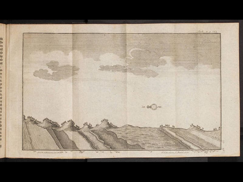 Lehmann was one of the first students of the earth to notice that two mountains could be similar in form but have quite different structures. He distinguished between what he called ore-bearing mountains, which had veins but no strata, and stratified mountains, which were made of limestone and sandstone in layers, and which usually contained fossils. In 1756, he published a book, Versuch einer Geschichte von Flötz-Gebürgen (Attempt at a History of Stratified Mountains) in which he showed how stratified rocks are built up, and he identified over 30 rock formations and gave them names, usually borrowed from local miners. If nothing else, his book demonstrated the futility of diluvialism, which postulated that rock strata had been deposited in one continuous sequence in the aftermath of the Great Flood, and Lehmann helped lay the foundation for the grand theories of the earth that would emerge thirty years later in the works of James Hutton and Abraham Werner. We featured Lehmann’s book as item 29 in our 1984 exhibition, Theories of the Earth, which is not yet available online.
