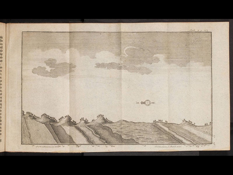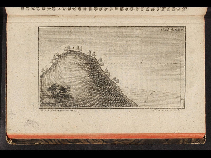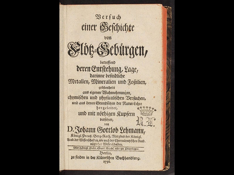 Lehmann was one of the first students of the earth to notice that two mountains could be similar in form but have quite different structures. He distinguished between what he called ore-bearing mountains, which had veins but no strata, and stratified mountains, which were made of limestone and sandstone in layers, and which usually contained fossils. In 1756, he published a book, Versuch einer Geschichte von Flötz-Gebürgen (Attempt at a History of Stratified Mountains) in which he showed how stratified rocks are built up, and he identified over 30 rock formations and gave them names, usually borrowed from local miners. If nothing else, his book demonstrated the futility of diluvialism, which postulated that rock strata had been deposited in one continuous sequence in the aftermath of the Great Flood, and Lehmann helped lay the foundation for the grand theories of the earth that would emerge thirty years later in the works of James Hutton and Abraham Werner. We featured Lehmann’s book as item 29 in our 1984 exhibition, Theories of the Earth, which is not yet available online.