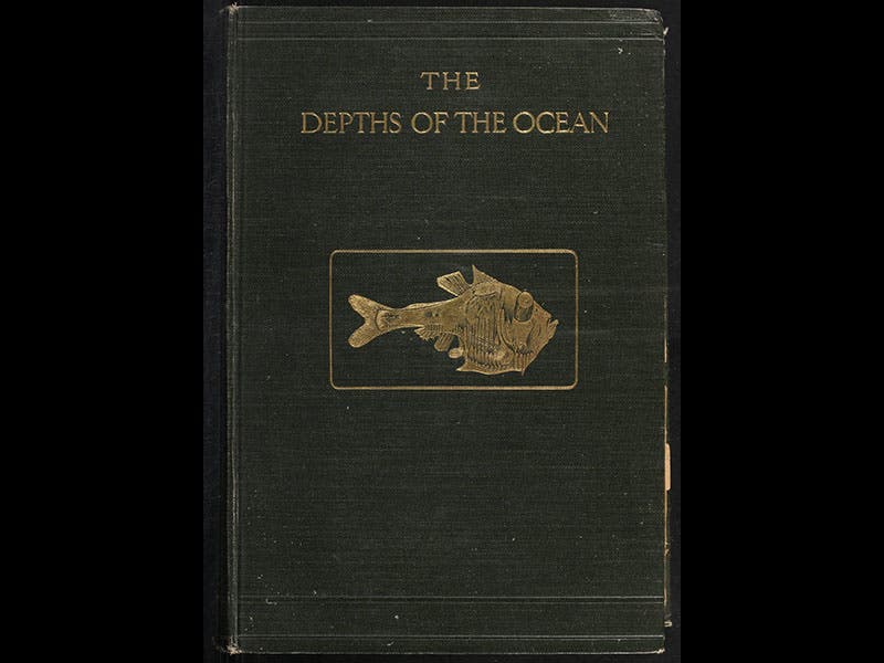 The voyage was richly successful, especially in terms of specimens brought up from the deep. It wasn't very long before that marine biologists thought that there was no life in the deep sea below about 300 fathoms (1800 feet). The Challenger voyager had brought up many invertebrates from the sea floor down to 2000 fathoms, and the Michael Sars was just as successful with free-swimming pelagic fish, hauling up many bizarre specimens that lived far from the light of day in waters that are miles below the surface. We see above several color plates of deep-sea fish, from the narrative of the expedition, The Depths of the Ocean, written by Hjort and Murray and published in 1912. It is one of the classics of oceanography. We acquired our copy several years ago. The wonderful gold-stamped cover was a welcome touch (third image). There are also several colored maps of the world’s oceanic deeps (fourth image), and steel engravings that depicted the equipment used, such as the deep-sea dredge (fifth image)