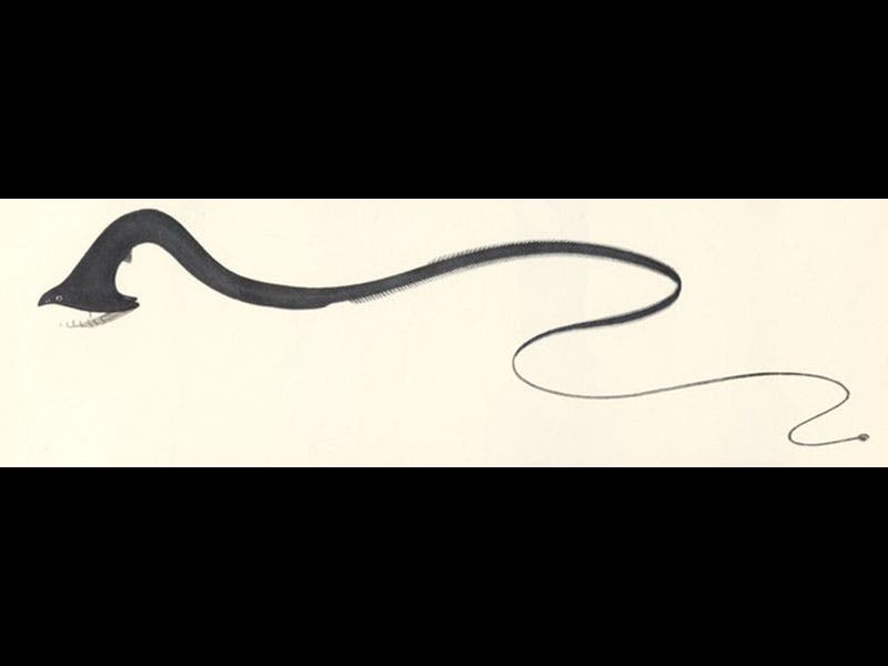 All of the specimens from the voyage, by prior agreement, went to the marine laboratory and museum at Bergen. One of the specimens still preserved there is a kind of gulper eel, named, after our subject, Saccopharaynx hjorti (sixth image). It was recovered at a station off the Azores, and it was not only the first specimen of its species ever discovered, it was also the last—no one since has ever found another one. That doesn’t mean it is extinct; it just means that we still have very little knowledge about what goes on in the deep, deep sea.
