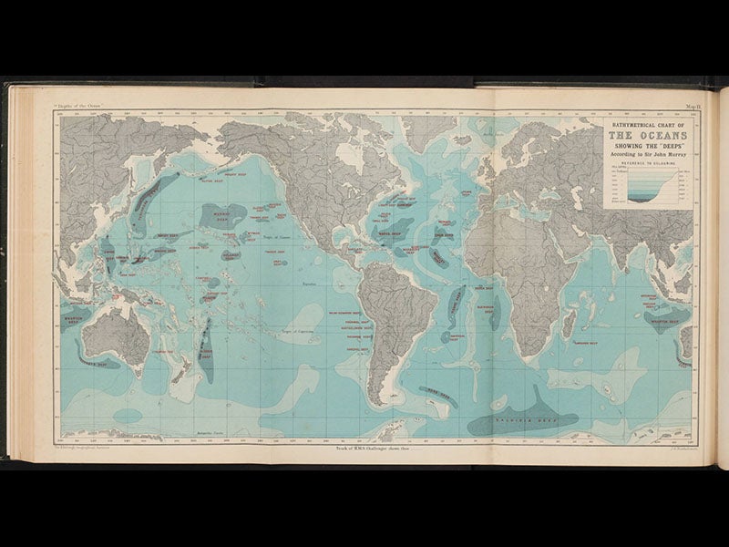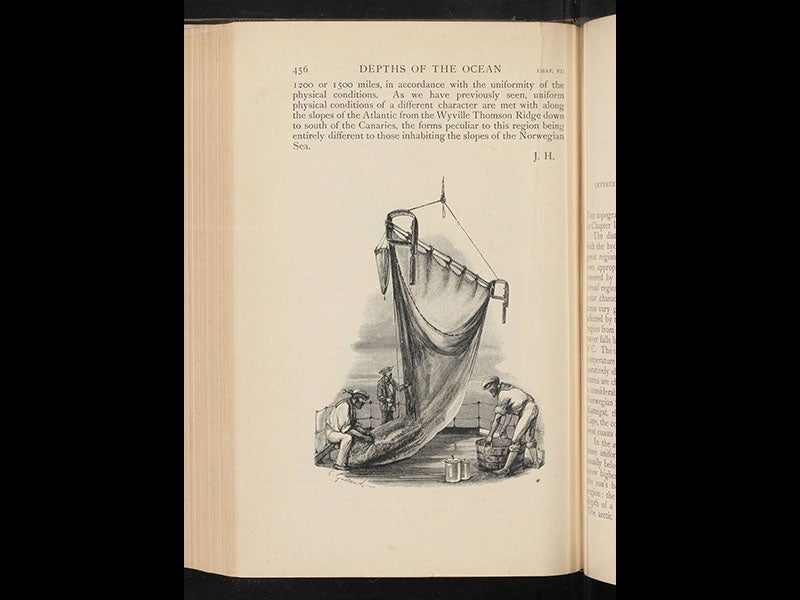 The voyage was richly successful, especially in terms of specimens brought up from the deep. It wasn't very long before that marine biologists thought that there was no life in the deep sea below about 300 fathoms (1800 feet). The Challenger voyager had brought up many invertebrates from the sea floor down to 2000 fathoms, and the Michael Sars was just as successful with free-swimming pelagic fish, hauling up many bizarre specimens that lived far from the light of day in waters that are miles below the surface. We see above several color plates of deep-sea fish, from the narrative of the expedition, The Depths of the Ocean, written by Hjort and Murray and published in 1912. It is one of the classics of oceanography. We acquired our copy several years ago. The wonderful gold-stamped cover was a welcome touch (third image). There are also several colored maps of the world’s oceanic deeps (fourth image), and steel engravings that depicted the equipment used, such as the deep-sea dredge (fifth image)