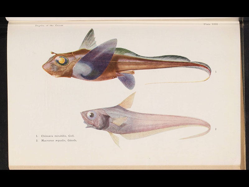 All of the specimens from the voyage, by prior agreement, went to the marine laboratory and museum at Bergen. One of the specimens still preserved there is a kind of gulper eel, named, after our subject, Saccopharaynx hjorti (sixth image). It was recovered at a station off the Azores, and it was not only the first specimen of its species ever discovered, it was also the last—no one since has ever found another one. That doesn’t mean it is extinct; it just means that we still have very little knowledge about what goes on in the deep, deep sea.