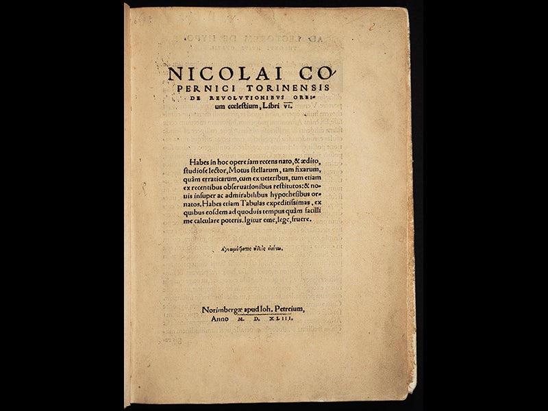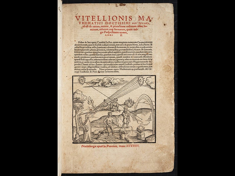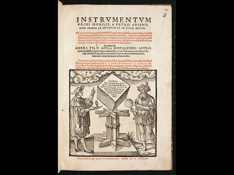 Johannes Petreius, a German printer, died in Nuremberg on Mar. 18, 1550; his day and year of birth are unknown. Petreius was the foremost publisher of scientific books in the sixteenth century. The most famous book to emerge from his press was De revolutionibus orbium coelestium (1543) by Nicholas Copernicus (see fifth image above), but Petreius also printed books by such important authors as Regiomontanus (fourth image above), Girolamo Cardano, Johannes Schöner, Peter Apian, Witelo, and Ptolemy of Alexandria. When Georg Joachim Rheticus went to visit Copernicus in 1539, he brought several books with him, as presents, including the Petreius editions of Apian’s instrument book (second image above) and Witelo’s book on optics (third image above). The suspicion is that Rheticus was trying to show Copernicus what a fine printer Petreius was, so that Copernicus might choose Petreius as publisher for his own book. And that is exactly how things turned out. A detail from the Regiomontanus book shows the typical Petreius imprint, embellished by a fine example of Petreius' ability to print complicated astronomical diagrams (first image above).