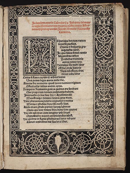 Johannes Regiomontanus, a German astronomer, was born June 6, 1436. Regiomontanus taught at Vienna in the 1450s, then travelled to Italy to take advantage of an opportunity to translate the Almagest, the great second-century astronomical treatise of Ptolemy of Alexandria, from its original Greek into Latin. Regiomontanus then moved in 1470 to Nuremberg to set up a printing establishment, the very first to be devoted to books of science and mathematics. His intent was to print the Almagest, Euclid's Elements, the complete works of Archimedes, as well as his own Epitome of the Almagest, as we know from a list he printed up of his proposed publishing program. He did publish an edition of the Roman astrological poet Manilius; a book called the New Theory of the Planets, written by his former colleague in Vienna, Georg Peurbach; and an astronomical almanac. But in 1476, Regiomontanus travelled to Rome to consult on the calendar problem, and there he died under mysterious circumstances--some think he was a plague victim, others that he was poisoned by academic enemies. Either way, his ambitious publishing program was cut short. Fortunately, his Epitome was finally published in 1496, in a beautiful edition, and it served as an introduction to Ptolemy's astronomy for several generations of students, including Nicholas Copernicus.