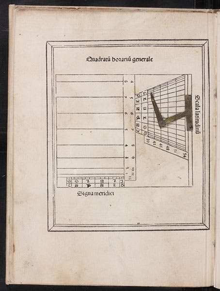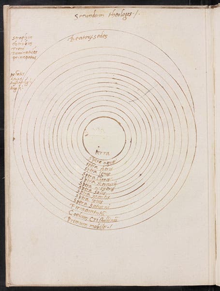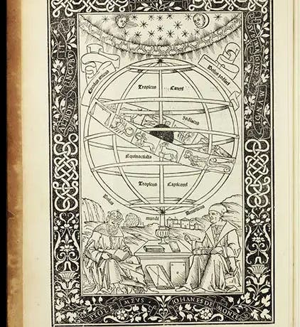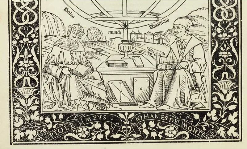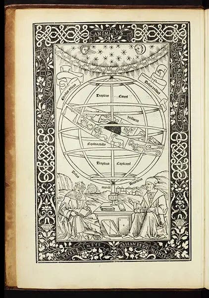 We do not have any imprints from the Nuremberg press of Regiomontanus--those are very scarce publications. But we do have a first edition of the Epitome, with a woodcut frontispiece (first image) that depicts an armillary at the top, and portraits of Ptolemy and Regiomontanus at the bottom (second image). We also have a 1485 edition of his almanac, called the Calendarium (third image), with an articulated brass pointer still riveted in place at the back (fourth image). Our copy has been annotated by an early owner, who not drew in with his compass, on a blank page, a nested set of cosmological spheres, as per Aristotle, but added in, at upper left, places for the nine orders of the heavenly host, from angels all the way up to seraphim (fifth image).