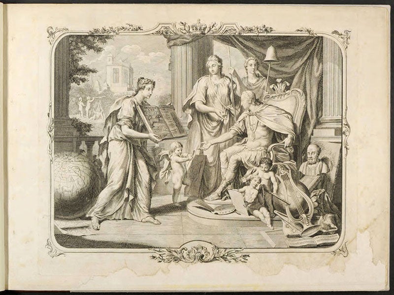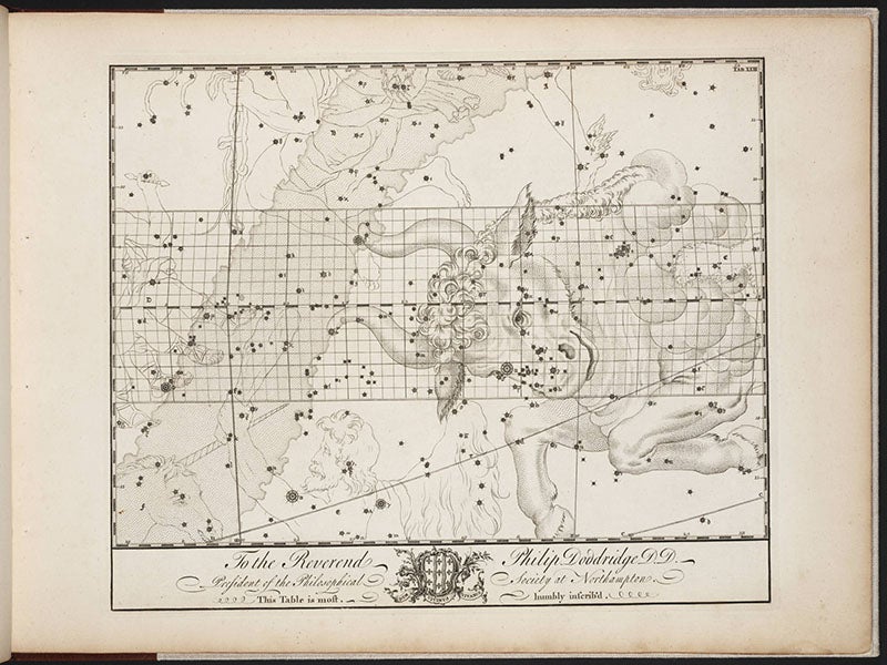 John Bevis, an English astronomer, was born Nov. 10, 1695. In 1745, Bevis set about publishing a new star atlas, intended to replace the celestial Atlas of John Flamsteed (1729). Bevis acquired subscribers, had the copper plates for the star maps engraved, and even pulled a number of prints from each plate. Unfortunately, around 1750, his printer went bankrupt, the plates were sequestered by the court, and the intended Uranographia Britannica was never published. However, a number of pre-publication proof sets survived, and we are fortunate to have one of these in the History of Science Collection. It even includes a handsome frontispiece (second image).