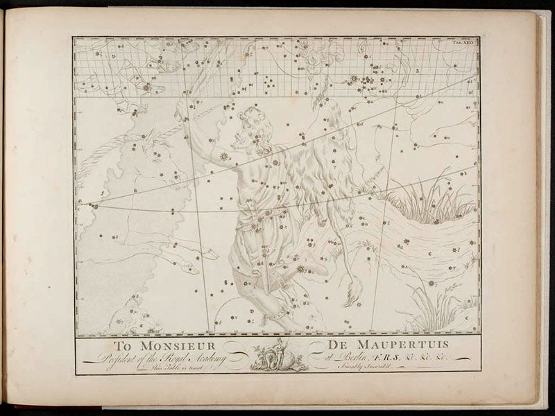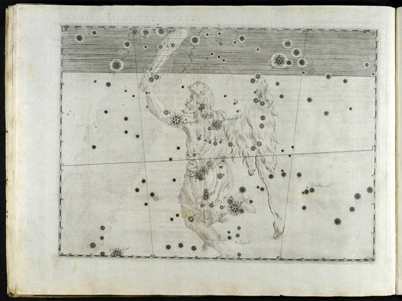 Bevis's Uranographia was modeled after Johann Bayer's Uranometria (1603), often called the first modern star atlas. Bayer’s Uranometria had 48 large engraved star maps, one for each of the 48 classical constellations, plus a 49th plate that showed the new southern constellations. Bevis's atlas has 49 plates as well, with each plate exactly the same size as those of Bayer, and utilizing the very same constellation figures, so that at first glance, they appear quite similar. But a closer look reveals important differences. Bevis’s charts have more stars, they are more carefully placed, and the bright, first-magnitude stars are not nearly so large and garish on Bevis's maps as they are in Bayer. If your compare the map of Orion in the Bevis atlas (third image) with the corresponding Orion chart of Bayer (fourth image), you will appreciate some of these differences.