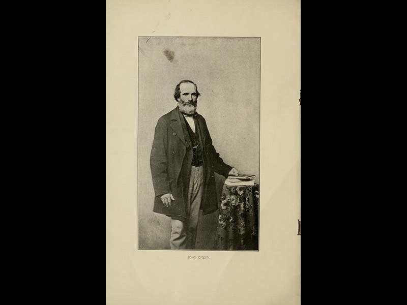 When we wrote about Townsend, we noted that he died at a young age, felled by arsenic poisoning as a result of his taxidermic work. Cassin suffered the same fate, dying in 1869 from arsenic poisoning, at the age of 55. His bird collection, all 4300 specimens, was acquired by John Whipple Potter Jenks for the Brown University Museum of Natural History. We will discuss the further fate of Cassin’s birds when we commemorate the death of Jenks on Sep. 26, 2017. The portrait of Cassin is from a 1902 issue of a short-lived ornithological journal, The Osprey.