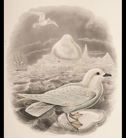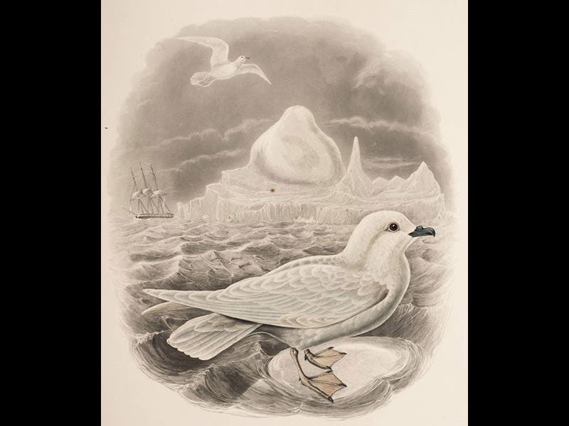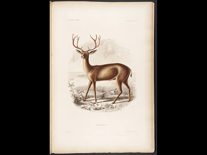 John Cassin, an American ornithologist, was born Sep. 6, 1813. We have featured several explorers and bird collectors in this space recently, including Meriwether Lewis and John Kirk Townsend, each of whom has a bird species named after them. Cassin's name has been applied to five birds, but interestingly, he discovered only one new bird species in his entire life. Mostly, he sat there at his desk in the Academy of Natural Sciences in Philadelphia (ASNP) and let the birds come to him. He became perhaps the most knowledgeable bird taxonomist of his era, and he named and described almost 100 new species, all discovered by others. When the Pacific Railroad Surveys went west, and the Mexican Boundary Survey went south, the specimens collected went straight to Philadelphia, and the reports of the surveys often contained a section on birds written by Cassin. He wrote only one book on his own, Illustrations of the Birds of California, Texas, Oregon... (1853-56), which was intended as a supplement to Audubon's Birds of America, with 50 plates illustrating species that Audubon had missed. We do not have the Illustrations in the Library (although we do have a fine facsimile, published in 1991 with an excellent introduction by Bob Peck, Senior Fellow at the ANSP and frequent speaker here at the Library). The one work we do have with Cassin listed as author (aside from the Reports of the Pacific Railroad and Boundary Surveys, which are in our collections) is an atlas volume, Mammalogy and Ornithology, published as volume 8 of the report of the United States Exploring Expedition (1858). The volume was supposed to have been written by Titian Ramsay Peale, who was part of the expedition and who drew most of the animals and birds for it. But Peale had a falling out with the head of the expedition, Charles Wilkes, and the project was turned over to Cassin. It is a beautiful volume, but most of the beauty is derived from the plates by Peale; Cassin restricted his contribution to revising and supplementing the text. The snow petrel and black-tailed deer above (first and second images) are from this volume.