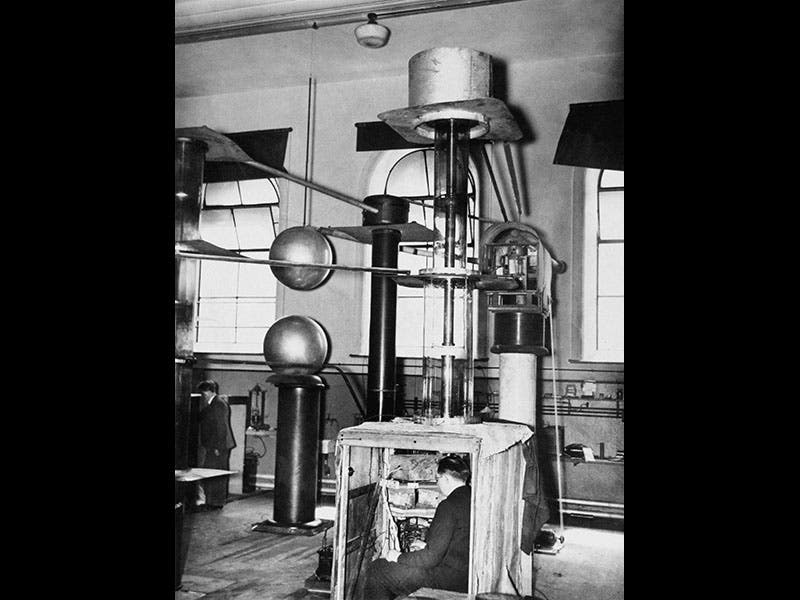 John Cockroft, a British physicist, was born May 27, 1897. In 1928, the Russian physicist George Gamow had discovered the first of many quantum effects in the nucleus; he had shown that a particle could escape the nucleus, even though it doesn’t have enough energy to do so, because it can “borrow” that energy for a split second. This should be possible because of Heisenberg’s Uncertainty Principle, which says that the amount of energy a particle has in a very small interval of time cannot be known with certainty. Cockroft and his lab partner, Ernest Walton, realized that it should therefore be possible to split the atom, if you hit it with a sufficiently energetic particle. So they built a proton accelerator—the world’s first particle accelerator—in the Cavendish Lab at Cambridge and had it up and running by 1932. We see a view of it above (first image); that is Cockroft in the viewing box below. With their machine, they bombarded lithium atoms with protons and split the lithium nucleus into two alpha particles (two helium nuclei). For their achievement, Cockroft and Walton were awarded the Noble Prize in Physics in 1951.