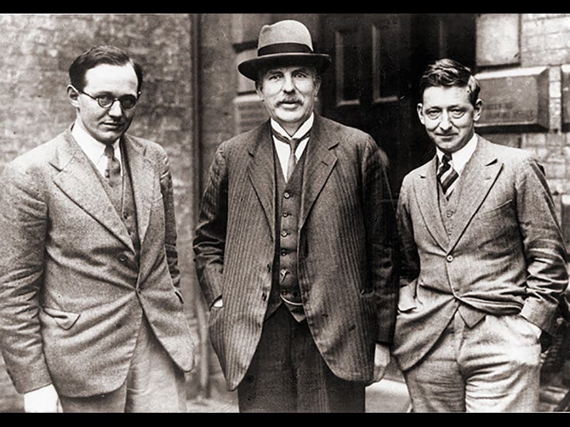 In 1939, Cockroft became a member of the MAUD committee, the British council that first determined that an atomic bomb was possible, and then convinced the United States to get involved. He is shown above (second image) with three other British physicists that played a prominent role in the development of nuclear weapons (Cockroft is on the far right). An earlier photograph, taken the same year that the atom was split, shows Cockroft (far right) and Walton flanking the long-time director of the Cavendish Lab, Ernest Rutherford (third image).