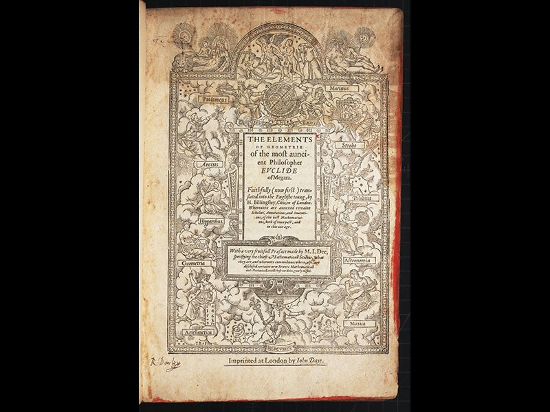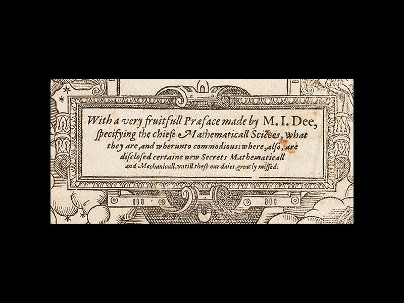John Dee, an English mathematician, alchemist, and all-round proto-polymath, was born July 13, 1527. Dee is better known today than many of his contemporaries, in a notorious sort of way, because of his involvement with Edward Kelley, an alchemical scoundrel who came into Dee's life when Dee was nearly 60 and managed to thoroughly ruin Dee's reputation and fortune. But Dee was actually a multi-talented fellow, and he should be remembered today for a remarkable preface that he wrote for the first English edition of Euclid’s Elements (1570), sometimes called the Billingsley Euclid, after the name of the translator, but just as often referred to as Dee's Euclid, because of his remarkable preliminary essay, usually called “Dee’s Preface.” The second image shows the woodcut title-page to Dee’s Euclid, and the third a detail of the box that proclaims Dee’s contribution.