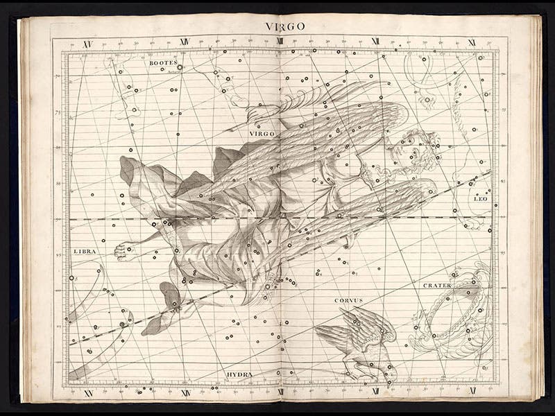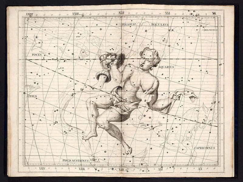 John Flamsteed, an English astronomer, was born Aug. 19, 1646. Flamsteed became the first Astronomer Royal of England in 1675, and he worked at the newly-built Greenwich Observatory for 44 years, observing the planets and the moon, and compiling a detailed catalog and atlas of the stars. The catalog is very important, since all the observations were Flamsteed's own, but his Atlas coelestis (1729) is of more interest to the general viewer, with its large constellation figures giving order to fields of stars. Some of the plates, such as Perseus and Andromeda (see first image above) and Bootes and the Hunting Dogs (second image) are quite pleasing, but others, such as Virgo (third image) and Aquarius (fourth image) are not especially attractive; Virgo, in particular, has her wings on the front, as if the constellation figure were originally meant to be seen from the rear, and then, at the last minute, was flipped around, without re-adjusting the position of the wings.