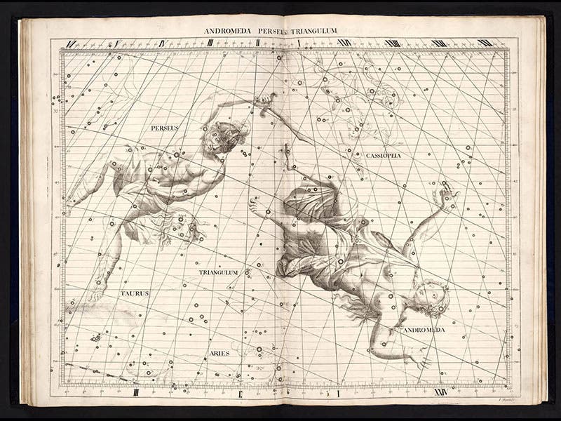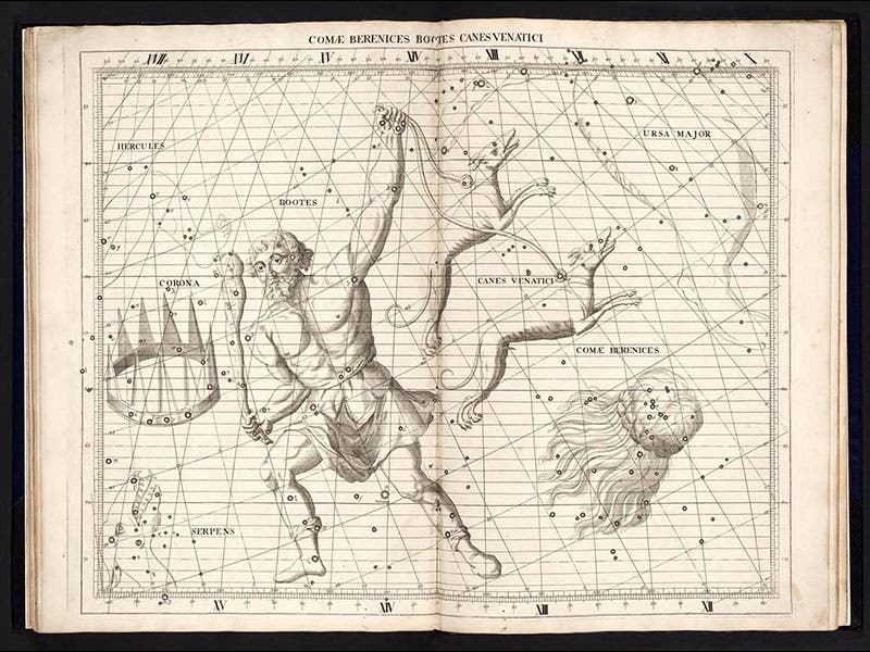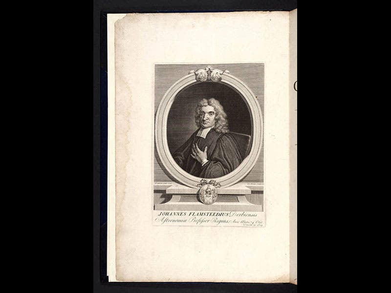 Whatever its failings in the aesthetics department, Flamsteed’s Atlas is of great significance for stellar astronomy, since it shows many more stars than any previous atlas, and the positions have been very accurately determined. The work was published ten years after Flamsteed’s death, and it carried a frontispiece portrait (fifth image) to commemorate England’s first Astronomer Royal.