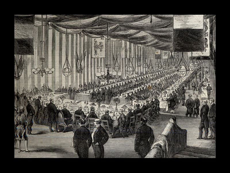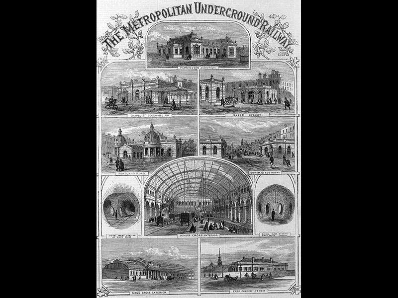 Sir John Fowler, an English civil engineer, was born July 15, 1817. Fowler is remembered today for two impressive engineering feats, separated by some 25 years. In 1858, Fowler was called upon to design and supervise the construction of the world's first subway, or underground, as it is known in most parts of the world. The Metropolitan Railway connected two points in London, Paddington Station and Farringdon Street, some 4 miles apart, and was opened in early 1863. The underground railway was built by what we now call the "cut-and-cover" method, although at the time there was no need for such a label, since that was the only method there was (second image). Except for extensions to the Metropolitan line, there would be no other subway in the world for over 30 years. The first image, which appeared in the Illustrated London News in late 1862, displays a composite of Metropolitan Railway features, including the two stations. The third image depicts a celebratory banquet held in Farringdon Station in 1863.