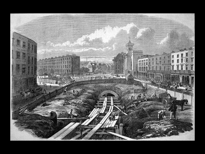 Sir John Fowler, an English civil engineer, was born July 15, 1817. Fowler is remembered today for two impressive engineering feats, separated by some 25 years. In 1858, Fowler was called upon to design and supervise the construction of the world's first subway, or underground, as it is known in most parts of the world. The Metropolitan Railway connected two points in London, Paddington Station and Farringdon Street, some 4 miles apart, and was opened in early 1863. The underground railway was built by what we now call the "cut-and-cover" method, although at the time there was no need for such a label, since that was the only method there was (second image). Except for extensions to the Metropolitan line, there would be no other subway in the world for over 30 years. The first image, which appeared in the Illustrated London News in late 1862, displays a composite of Metropolitan Railway features, including the two stations. The third image depicts a celebratory banquet held in Farringdon Station in 1863.