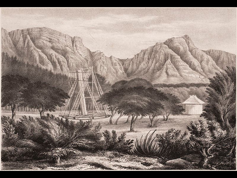 John F. W. Herschel, an English astronomer and philosopher, was born Mar. 7, 1792. He was the son of William Herschel, who in the 1780s built the world's largest reflecting telescopes, with which he discovered thousands of deep sky nebulae (as well as the planet Uranus, discovered by William with a small reflector in 1781). John carried on the family astronomical tradition (Caroline Herschel was his aunt), at one point taking his father's 20-foot reflector to Table Mountain at the Cape of Good Hope in South Africa, where he spent four years observing the southern skies (first image). But Herschel was also interested in scientific method, and his book, A Preliminary Discourse on the Study of Natural Philosophy (1830) had a profound effect on many up-and-coming young scientists, including one Charles Darwin, who cited Herschel's Preliminary Discourse as one of the two most important and influential books he read (the other being Alexander von Humboldt's Personal Narrative).