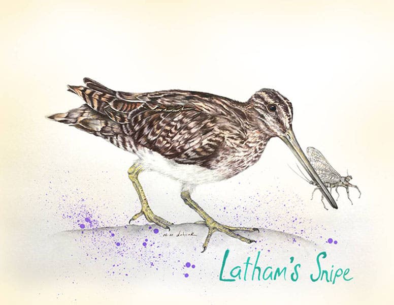 One bird that Latham did not illustrate was the bird named after him, Latham’s snipe. For a representation, we prevailed on the Library’s resident artist and designer, Melissa Dehner, to provide a pencil sketch (first image). This is the eighth eponymous bird that Melissa has drawn for our Scientist of the Day column. All are quite delightful.