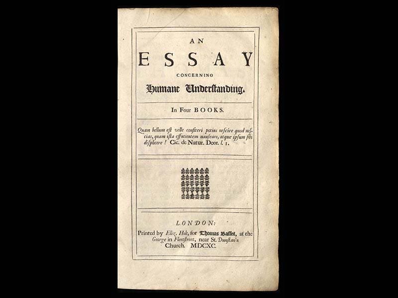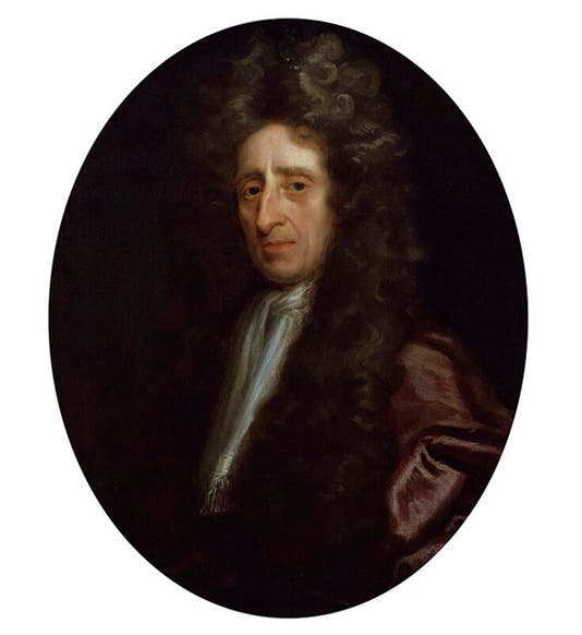 There are many portraits of Locke in the National Portrait Gallery in London; we show above one by Michael Dahl (1693; first image), and another, after an original by Godfrey Kneller (1704; third image). We do not own the Essay Concerning Human Understanding; the title page displayed above is from a copy at the University of Utah.