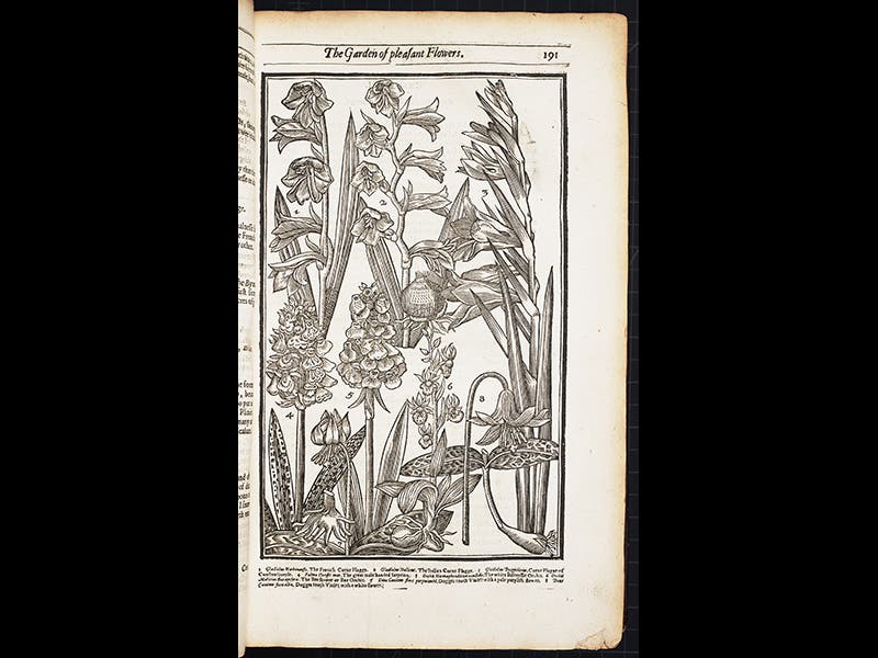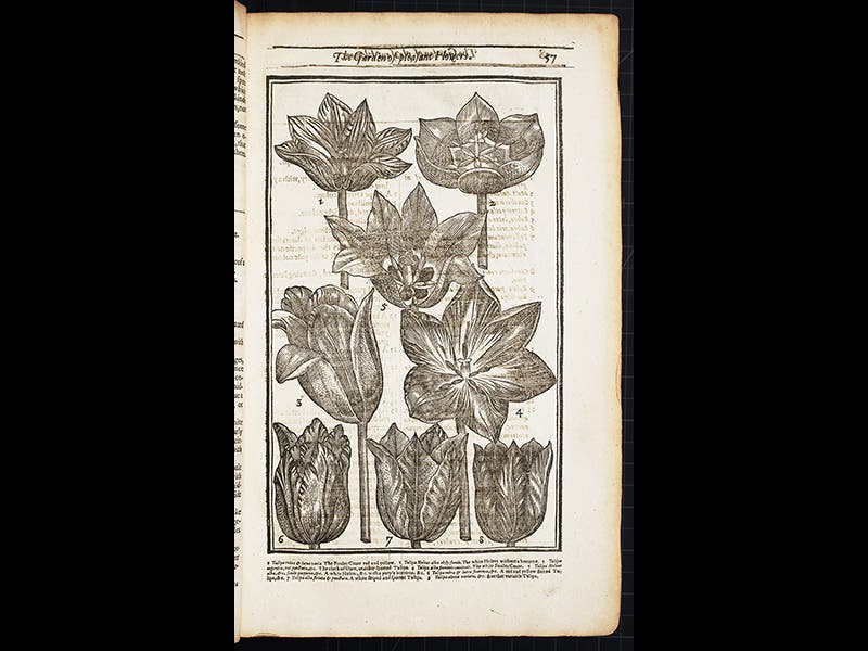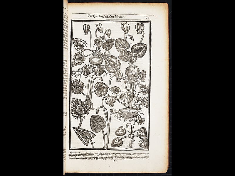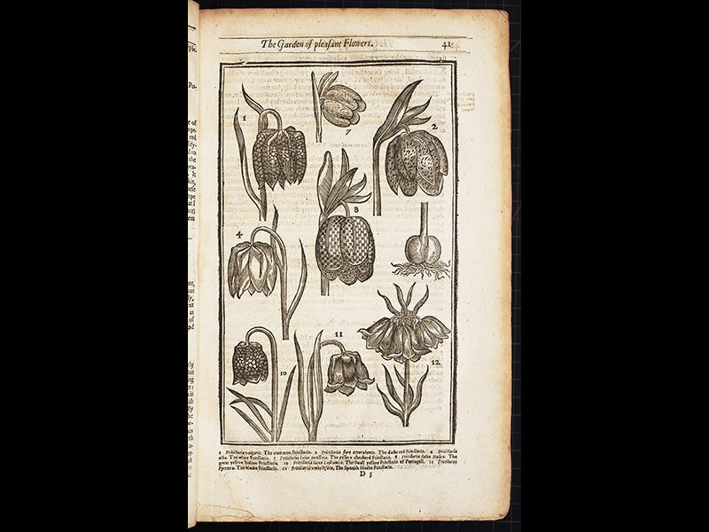 We feature today Parkinson's flora, the Paradisi in Sole. The woodcut title page is quite playful, showing, not the traditional Garden of Eden, but Parkinson's own garden, with Adam and Eve as caretakers (see first image above). Some of the flowers featured, at the front, are new introductions to England from eastern Europe and the Middle East, plants such as the tulip, fritillary, dog's tooth, and cyclamen. Nearly every plant depicted on the title page has its own section within the book; we display above woodcuts of the four plants just mentioned, in that order.