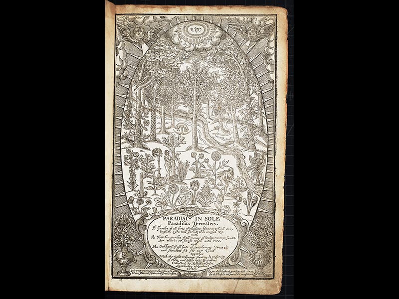 John Parkinson, an English botanist, was buried Aug. 6, 1650, at the age of about 83. He was the official apothecary to King James I and the royal botanist for his successor, Charles I. Parkinson published two botanical works that make an interesting pair. The first book, Paradisi in Sole Paradisus Terrestris (1629) is often considered the first purely horticultural book in England, meaning it is a book about gardens and flowers. Eleven years later, Parkinson published Theatrum Botanicum (1640), a massive compendium that is often called the last of the English herbals. An herbal, unlike a flora, is concerned with the medicinal properties of plants, and herbals had been the dominant form of botanical publication ever since Dioscorides in the 1st c. AD. I suppose it is not improbable that the same man could publish the last herbal and the first flora. The surprise is that Parkinson published the first flora 11 years before he gave us the last herbal. We have copies of both works in our Library, although our Paradise in Sole is a second printing (1635).