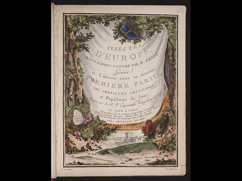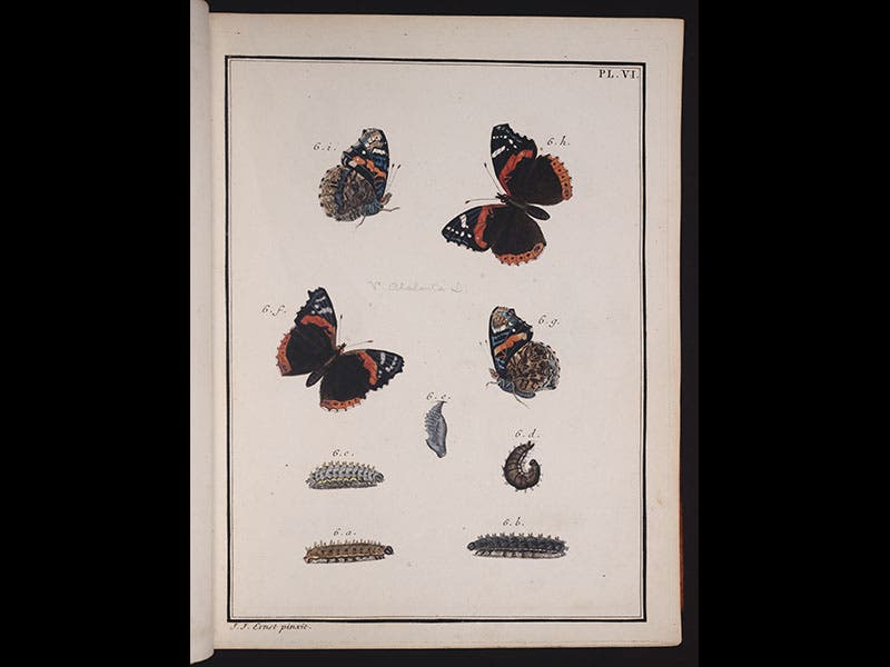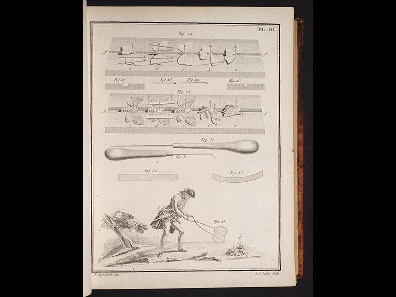Even without the J.Q. Adams provenance, the Papillons d' Europe would be a special work, with the many figures of butterflies and moths engraved and then beautifully hand-colored. We show above several of the hundreds of plates, depicting red admirals (fourth image) and some sphinx moths (fifth image). Three uncolored plates even show the equipment and catching techniques needed to be a lepidopterist, including one demonstrating the use of a unique scissors-style collecting net (sixth image).