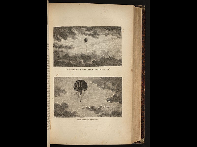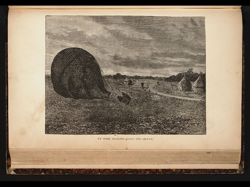 Wise also made a trip from St. Louis to New York in 1859, which he self-proclaimed the most amazing balloon voyage of all time (this in his book, Through the Air: a Narrative of Forty Years’ Experience as an Aeronaut, 1873, which we have in our collections). He did make a drawing of Niagara Falls from the air that is rather impressive (third image). During this trip, his balloon almost landed in Lake Ontario, which made for an even more dramatic pictorial record (first image).