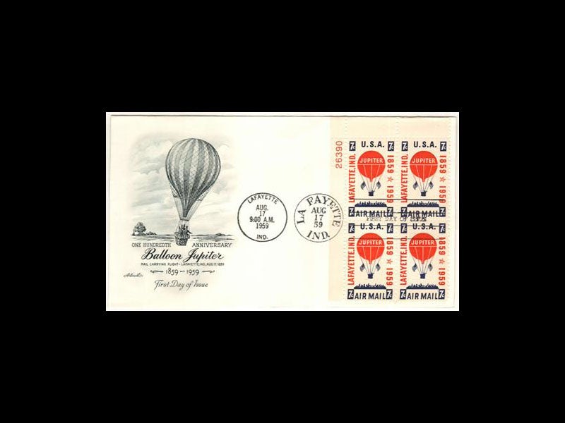 Wise's other claim to fame is that he made the nation's first airmail delivery for the US Postal Service. This was on Aug. 17, 1859, when he took off from Lafayette, Ind., with some 120 letters and a few flyers, headed for either New York or Philadelphia (fourth image). His balloon was called The Jupiter, and the feat was commemorated, on the centennial of the flight, with a postage stamp, the 7¢ Jupiter of 1959 (fifth image). Purdue University traces the origin of its School of Aeronautics to the ascent of the Jupiter, even though the University wasn't even founded until 10 years later (and the School of Aeronautics not until 1945). What is often lost in all this hoopla is that the Jupiter made it approximately 2% of the way to New York, coming down in a field just 25 miles east of Lafayette (sixth image). Wise hardly mentions his role as postal carrier in his book, commenting only that when he realized that the journey east was about to end, he dropped the letters to the ground via a handmade parachute. No wonder only one letter survived; it is in the Smithsonian Institution.