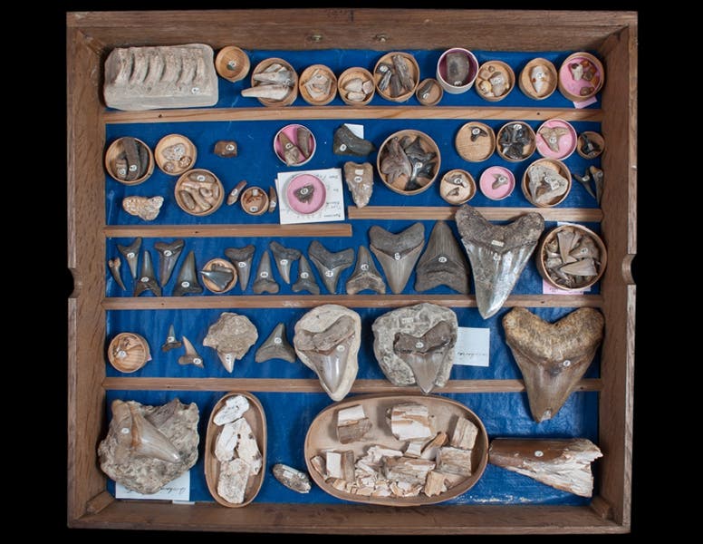 When Woodward died, he left funds to establish a “Professorship of Fossils” at Cambridge University. Although now called the Woodwardian Professor of Geology, the chair is still with us. Adam Sedgwick, the discoverer of the Cambrian system, sat in it for over 55 years, from 1818 to 1873. Woodward’s fossil collection, also bequeathed to Cambridge, is now in the university’s Sedgwick Museum of Earth Sciences. Because of the carefully-thought-out provisions of Woodward’s original bequest, the collection is still intact—in fact, it is still shelved in the 5 original cases that Woodward himself had commissioned. We see above one of the cases (fourth image), and one of the drawers (first image), this one housing various glossopetrae, or sharks’ teeth.
