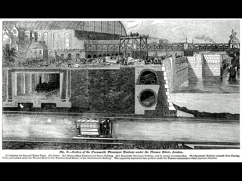 Bazalgette’s crews built over 80 miles of underground brick sewage tunnels in London, and at least a thousand miles of street sewers to feed the tunnels. He laid out three parallel lines north of the river, which took sewage to the east, far downstream of London, and two south of the river that did the same thing. The most noteworthy line was the so-called "interceptor line", which ran just north of the river and intercepted all the sewage lines that heretofore had drained straight into the Thames. To house the sewage tunnel as it ran along the river, Bazalgette opted to build a massive embankment, then called the Thames Embankment, right on the edge of the river. The embankment would cover up the unsightly mudflats, house the sewer line, utility lines, and an underground railway, and provide as a bonus a broad top surface suitable for a carriage road and pedestrian pathways. You can see above a contemporary engraving, showing a section through the embankment (first image). In addition, Bazalgette built four massive pumping stations to move the sewage along; some of these were works of art in their own right.