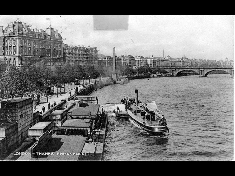The London sewer system was opened by the Prince of Wales in 1865, although the embankments would not be finished until 1874. In due course, the embankment north of the river, between Westminster and Blackfriars Bridge, would be named Victoria Embankment, the shorter stretch south of the river would be called the Albert Embankment, and the stretch just upriver, in Chelsea, the Chelsea Embankment. Above is a view of the Victoria Embankment taken about 1900 (second image). The embankments are still one of the hallmarks of central London, their charm considerably augmented by the sturgeon lampposts designed by George Vulliamy and set in place when the Victoria Embankment opened in 1870 (third image); see the SoD for May 19, 2015.
