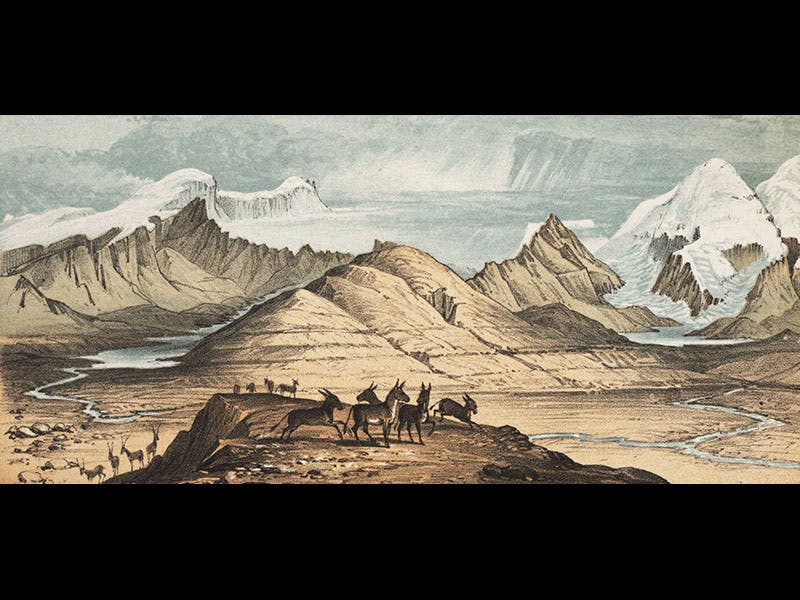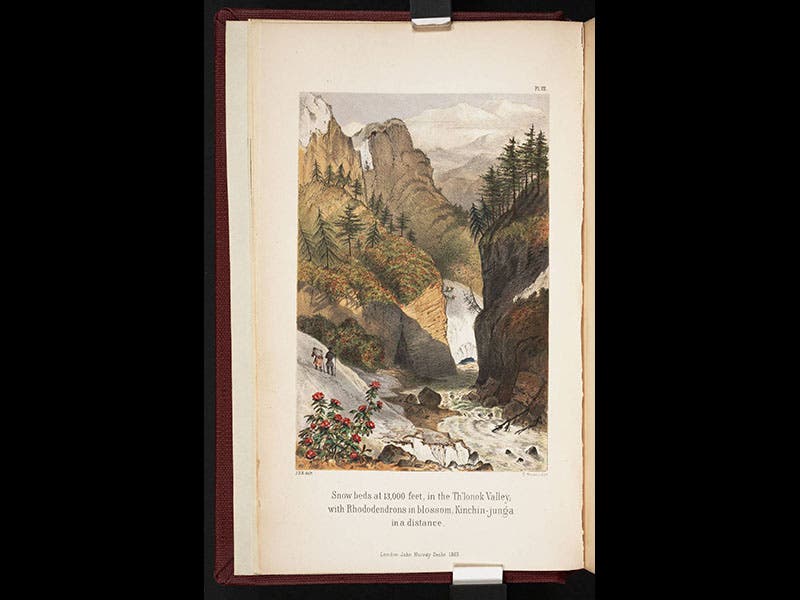 Hooker was a formidable botanist in his own right, visiting India, Nepal, and the Himalayan region in the early 1850s. He published a travel narrative, Himalayan Journals, in 1854, which we have in our collections, and from which the first three illustrations above were taken. One of them depicts native rhododendrons, samples of which Hooker brought back to plant in English gardens, where they became (and remain) quite the floral sensation. Another shows Tso Lhamo lake, in North Sikkim, India, one of the highest lakes in the world, at some 17,500 feet, indicating Hooker did not take the easy path through the sub-continent. All of the scenes were based on sketches by Hooker.