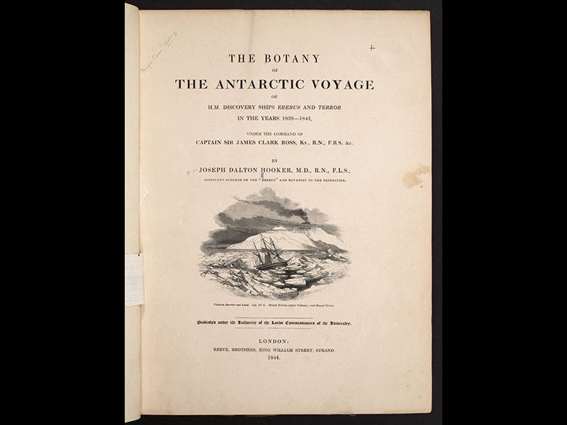 Earlier, Hooker had served as assistant surgeon on the voyage of HMS Erebus (with HMS Terror) to Antarctica, and he published the first book on the plant life of southern lands, The Botany of the Antarctic Voyage of H. M. Discovery Ships Erebus and Terror (1844). The title-page vignette depicts one of the more significant discoveries of that voyage, the Antarctic volcanoes Erebus and Terror, one of which (Erebus) is still active (fourth image). The vignette was based on drawings by Hooker that still survives in the library of Kew Gardens (fifth image).