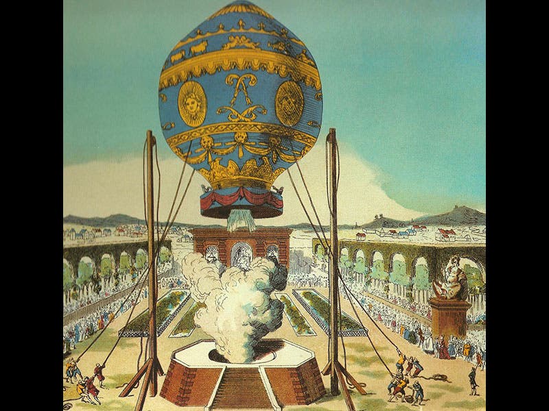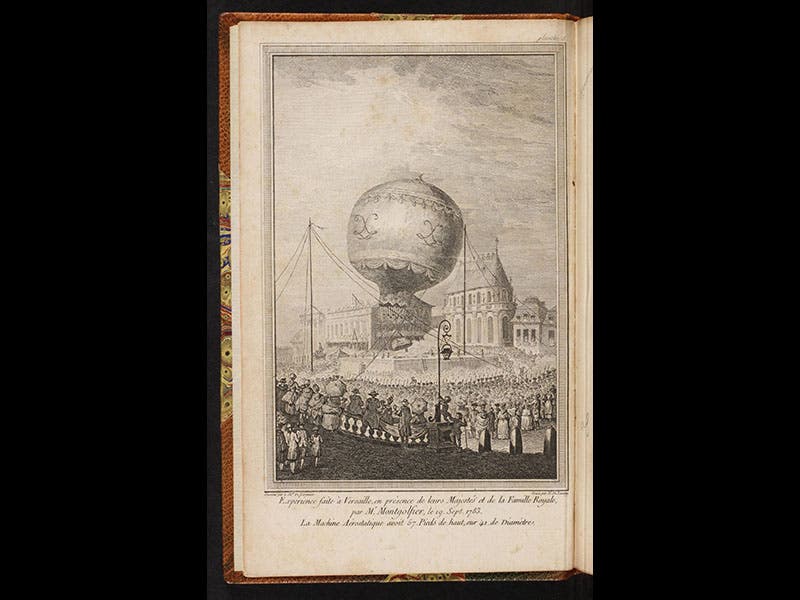 On Sep. 19, 1783, a large hot-air balloon slowly lifted from the grounds of Versailles Palace outside Paris, leaving behind a vast and cheering crowd. The passengers were a rooster, a sheep, and a duck, the first living creatures ever to ascend from the earth in a man-made machine. The balloon was garishly decorated, as though it were made of wallpaper removed from some French salon, which is not too surprising, since the balloon was built by two paper manufacturers, Étienne and Joseph Montgolfier, in collaboration with Jean-Baptiste Reveillon, a wallpaper baron. A Montgolfier balloon had first gone airborne three months earlier, with no one on board, and the next venture, in November, would carry two humans, but this launch of Sep. 19 was given over to the animal kingdom. An engraving commemorating the faunal affair (first image) serves as the frontispiece to the first volume of Barthélemy Faujas de Saint-Fond, Description des expériences de la machine aérostatique de MM. de Montgolfier (1783), a book in our History of Science collection. It does not, unfortunately, provide any view of the passengers. Other images above depict the first manned flight of Nov. 21, 1783 (second image) and a model of a Montgolfier in the National Air and Space Museum (NASM; third image).