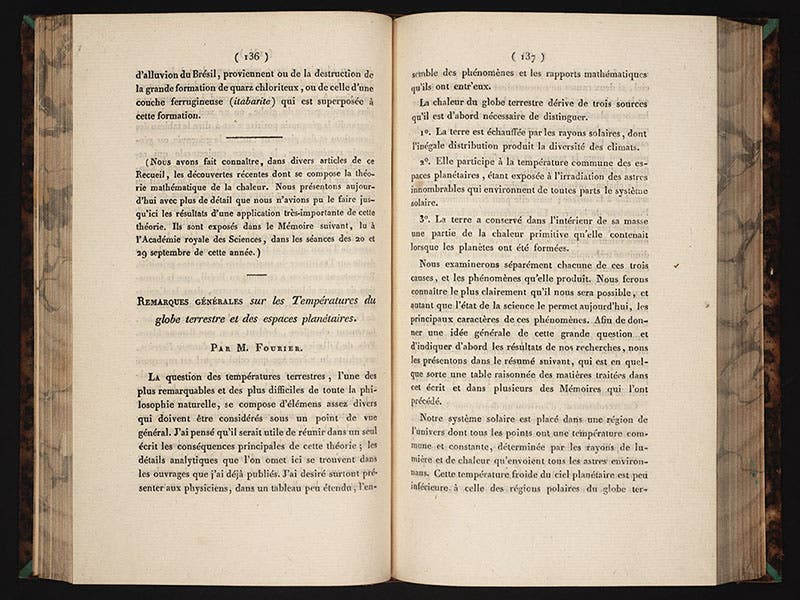 Fourier is best known for various contributions to mathematics, such as Fourier equations, and Fourier transforms, which we will not attempt to explicate here. But he did apply his mathematical skills to one aspect of natural science that we can all appreciate: he discovered the greenhouse effect. He calculated the temperature that the earth ought to have, given the energy it gets from the sun, and he came up with a figure of about 16 degrees below zero Celsius, whereas the earth's temperature actually averages about 16 degrees above, a 32-degree difference. He did some experiments with glass-covered containers, and he concluded that just as a glass shield will produce a warming effect in a vessel, so there must be something in the earth's atmosphere that reflects heat back to the earth. He published this conclusion in a paper in 1824, called “Remarques générales sur les températures du globe terrestre et des espaces planétaires,” which appeared in the Annales de chemie et de physique. We have this journal in our serials collection (second image). Fourier did not understand the role of carbon dioxide and other "greenhouse gases" in producing the greenhouse effect, nor did he give it a name; that discovery, and the label, would come later in the century. But the history of our understanding of global warming starts with him.