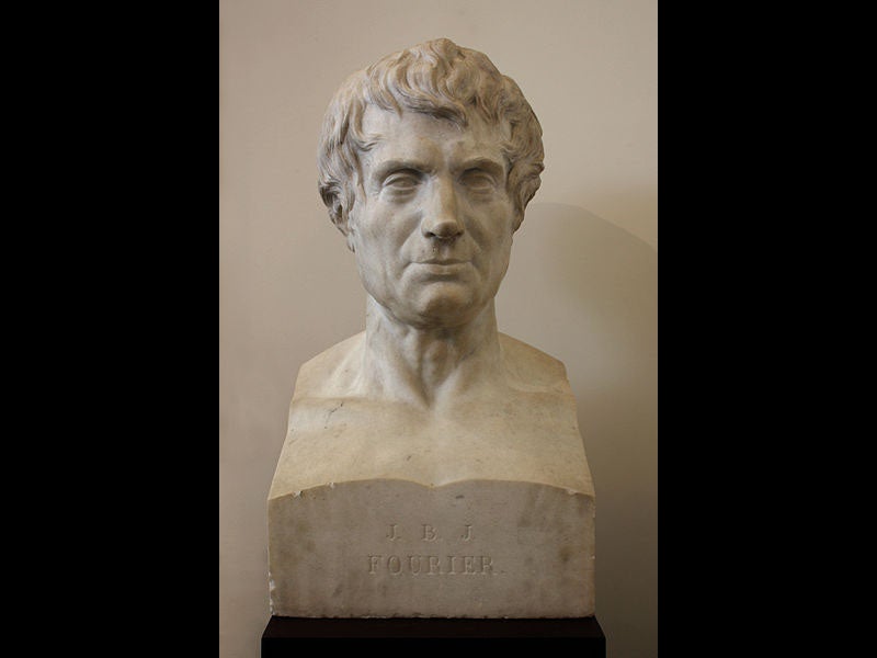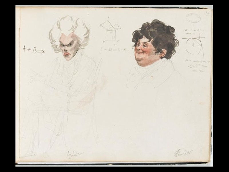 There is a bust of Fourier in Grenoble, where he served Napoleon for some years after Napoleon became emperor (third image). And there survives a wonderful caricature of Fourier (fourth image). Fourier is the cherubic rotundity on the right; the maniacal face on the left is that of another great French mathematician of the time, Adrien-Marie Legendre.