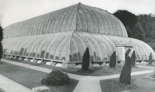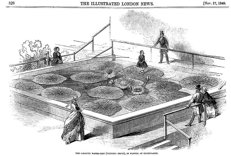 Sir Joseph Paxton, an English gardener and architect, was born Aug. 3, 1803. When still a young man, Paxton was hired by William Cavendish, the 6th Duke of Devonshire, to oversee the restoration of the gardens at the family estate of Chatsworth, in Derbyshire. Paxton made the Chatsworth gardens one of the grandest in the world. In 1841, he completed the "Great Stove," a huge football-field-sized greenhouse, which at the time was the largest glass building in the world (see first image above). Charles Darwin visited Paxton and Chatsworth in 1845. Another construction at Chatsworth was the Lily House, built specifically to shelter the world's largest water lily, Victoria amazonica (called Victoria regia in Paxton's day). Not only did he house the lily, he coaxed it into flowering, the first time anyone had done so outside of South America (second image).