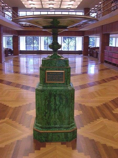 The Duke generously allowed his head gardener to take on other projects, and Paxton designed and built the famous Crystal Palace for the Great Exhibition of 1851 in London (third and fourth images). This was an enormous glass and cast iron structure that quickly took over honors as the world's largest glass building, being over 1800 feet long and 120 feet tall. We have good reason to believe that the green malachite tazza, that now stands in the Library’s reading room, once stood inside Paxton’s glass house, as part of the Russian exhibit at the fair (fifth image).