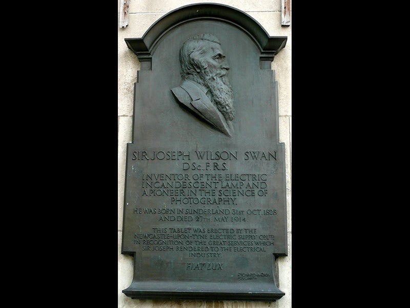 Why do most people think of Edison as the inventor of the light bulb? Probably because Edison knew that a light bulb was useless without an entire supply system, an electric power grid, which he developed in short order. And because he was a very good inventor, even if he sometimes forgot to tell people that he borrowed a few of his good ideas. And because he held the patents. But the British remember Swan, especially since the Electric Lamp Centenary put him back on the map in 1979. He has a blue plaque in Newcastle and a better plaque nearby that isn’t blue (fourth image), and a portrait in the National Portrait Gallery (fifth image), and one of his early bulbs is on display in the Science Museum in London (first image; Swan’s bulb is on the left, Edison’s on the right). And, dubbed Sir Joseph in 1904, he has a knighthood, the one honor that Edison could never receive in his country without a king.