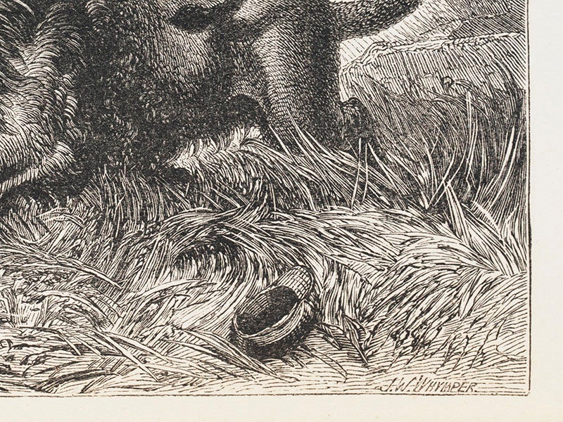 Josiah Wood Whymper, an English wood engraver, was born Apr. 24, 1813. Whymper was a worthy heir to the British tradition of wood engraving that had been inaugurated by Thomas Bewick in the 1790s, and not surprisingly, Whymper devoted some of his attention to British birds, as had Bewick. The first three images above are from British Birds in their Haunts (1862), by Charles Alexander Johns; Whymper did all of the hundreds of engravings, after drawings by Joseph Wolf, one of the best animal artists of mid-century Victorian England. But Whymper also did the engravings for David Livingstone's Missionary Travels (1858), images from which we featured on the Scientist of the Day for Mar. 19, 2015. The fourth image above shows a detail from one of the Livingstone engravings, the famous one of the snarling lion hunkered down on Livingstone, and you can see Whymper's signature at bottom right. And Whymper also cut the woodblocks for Naturalist on the River Amazon (1863), by Henry Walter Bates; the fifth image shows the frontispiece to volume 1, depicting Bates encountering the glories of the tropical jungle.