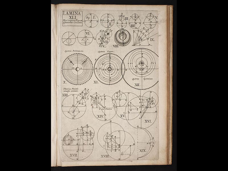 One of the plates depicts the geocentric Tychonic cosmological system (fourth image), which Caramuel, like the Jesuits, apparently favored. We can tell this because on another plate, where the Copernican and Ptolemaic cosmologies are also shown, the Tychonic on the right is made slightly larger (fifth image). On the emblematic title page (first image), the two heads of the mathematical muse at top represent Theory and Practice, and she was inspired by the emblem of the Habsburg emperor, a two-headed eagle.