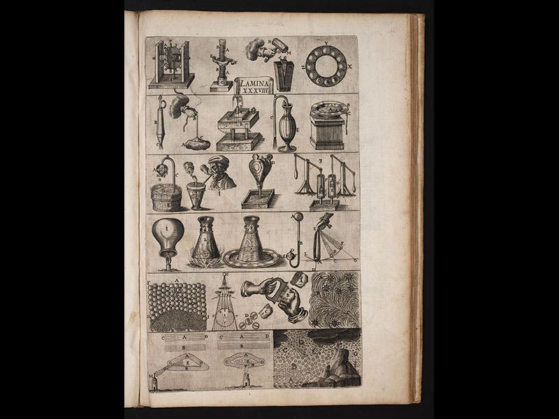 Caramuel’s Mathesis Biceps (“Two-Headed Mathematics”) was published in 1670, and, with its two fat text volumes and a third volume of plates, it is one of the most complete encyclopedias of the mathematical sciences published in the 17th century. We have a fine set in our History of Science Collection. A selection of plates (see images above) shows us that mathematics was very broadly construed by Caramuel, since in addition to geometrical diagrams and pictures of mathematical instruments, there are musical scales, dissected cats, fortification plans, magnetic fields, and cosmological diagrams.
