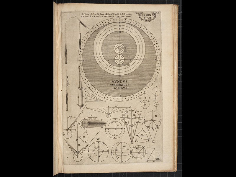One of the plates depicts the geocentric Tychonic cosmological system (fourth image), which Caramuel, like the Jesuits, apparently favored. We can tell this because on another plate, where the Copernican and Ptolemaic cosmologies are also shown, the Tychonic on the right is made slightly larger (fifth image). On the emblematic title page (first image), the two heads of the mathematical muse at top represent Theory and Practice, and she was inspired by the emblem of the Habsburg emperor, a two-headed eagle.